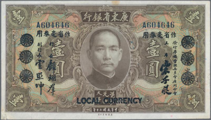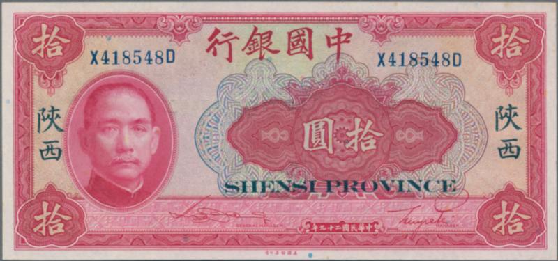 China Bank of China, 10 Yuan 1940 with black overprint in Chinese right and left margin and in English in lower centre "Shensi Province", P. 85 b ref., UNC. Overprint maybe not original, will be sold as it is. Catalog number(s): P. 85 b This lot is "Gebotslos". The Minimum Bid is 20 €, it will be sold at the HIGHEST BID (not one bidding step above the second highest bid). (Image)