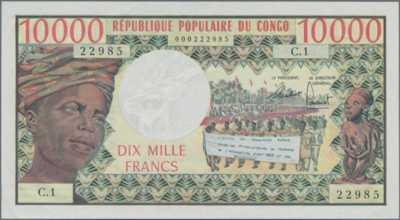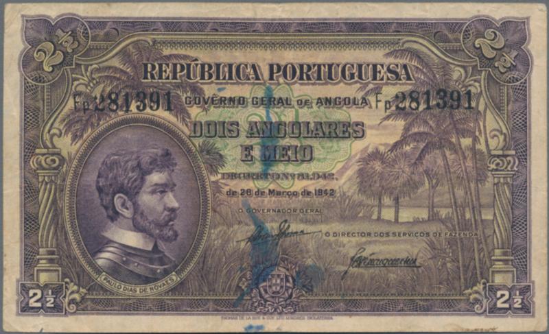 Angola 8 different better banknotes from Africa: Angola, 2 1/2 Angolares 26.3.1942, VG (heavy ink stains), P. 69, French Somaliland (Dijibouti), 100 Francs ND (1946), VG/F, P. 19A, French Equatorial Africa, 5 Francs 1944, P. 15c, VF, Cameroon, 500 Francs ND (1962), P. 11, stains, VG, Congo DR, 1000 Francs 1962, P. 2, VG, Malawi, 50 Tambala 1975, P. 9 c, unc, Malawi, 10 Shillings 1964, P. 2, dirty, stains, VG-F, East Africa, 5 Shillings ND (1958-1960), P. 37, GVF, 8 Notes, all of them scarce Catalog number(s): P. 69 (Image)