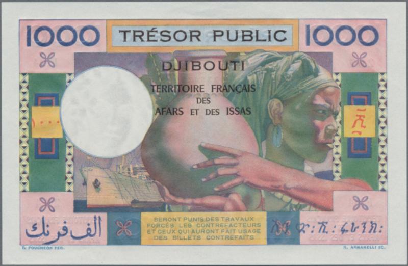Djibouti Trésor Public, Terretoire Francais des Afars et des Issas, 1000 Francs ND (1947), P. 32, AU/UNC Catalog number(s): P. 32 (Image)
