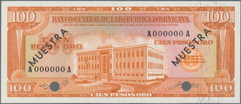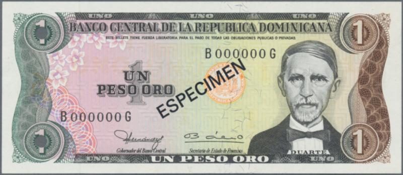 Dominican Republic Banco Central de la República Dominicana, lot with 1, 50 and 1.000 Pesos, series 1975-80, SPECIMEN, P.112s1, 115s1, 117s1, all in UNC condition. (3 pcs.) Catalog number(s): P. 112s1, 115s1, 117s1 This lot is "Gebotslos". The Minimum Bid is 20 €, it will be sold at the HIGHEST BID (not one bidding step above the second highest bid). (Image)