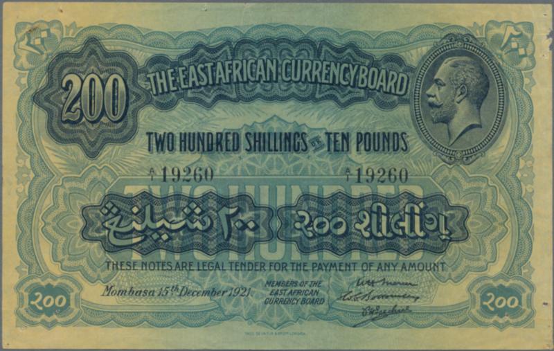 East Africa 200 Shillings 15.12.1921, multiple, partly rusty, pinholes, right upper margin small paper loss, otherwise strong paper and extremely rare banknote. Net VF, P. 12 Catalog number(s): P. 12 (Image)