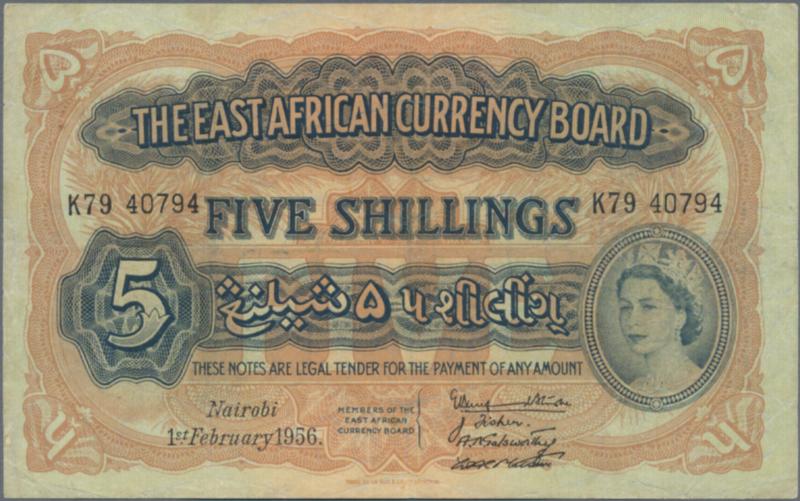 East Africa 5, 10 Shillings 1.2.1956, P. 33,34, small stains, VF Catalog number(s): P. 33 (Image)