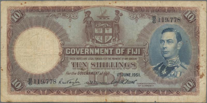 Fiji - Bank notes 10 Shillings, 1 Pound 1.6.1951, stains, VG Catalog number(s): P.38 k (Image)