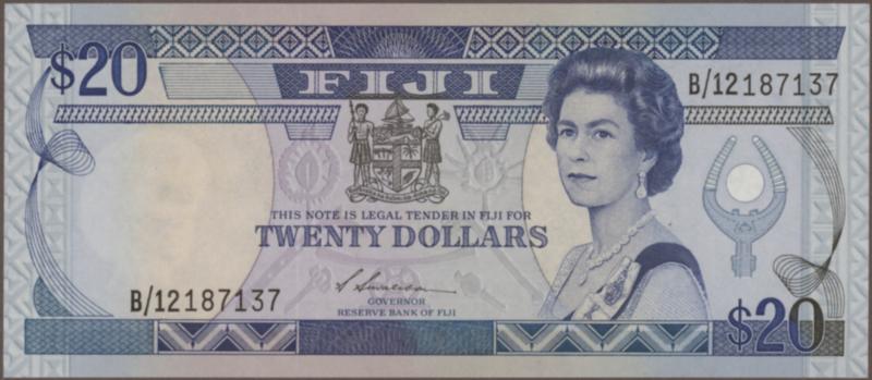 Fiji - Bank notes collection of 15 different notes, 11 x UNC and 4 x F, including some better issues, 5 Shillings 1.6.1951 (F), 1 Pound 1.12.1965 (F), 20 Dollars 1988 (P. 88), UNC, the modern issues up tp 100 Dollars. Catalog number(s): P. 88 (Image)