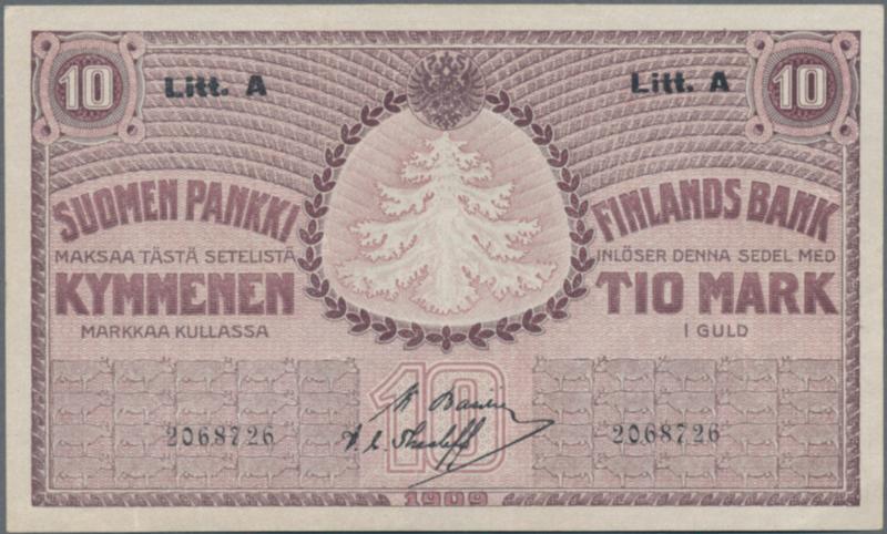 Finland 10 Markkaa 1909 Litt. A, P. 25, XF-AU Catalog number(s): P. 25 (Image)