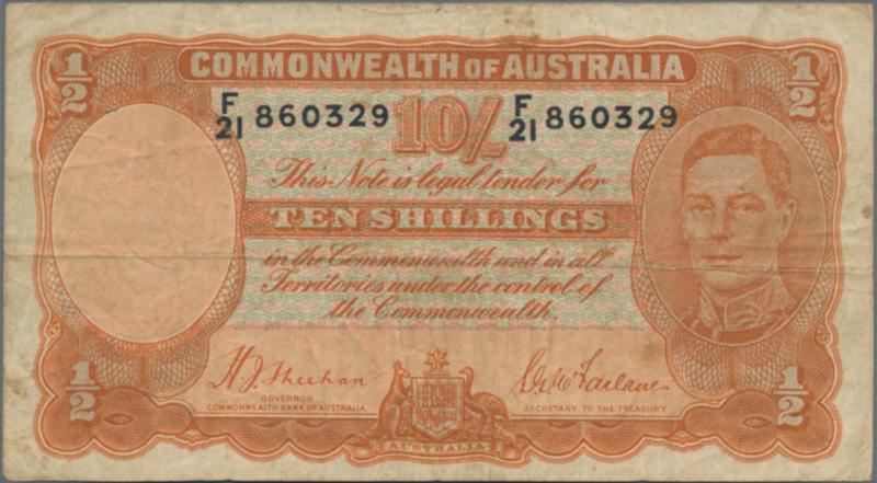 Australia Commonwealth Bank of Australia, set with 10 Shillings, 1 and 5 Pounds ND(1939-52), P.25a, 26a, 27d, Condition: F/F-. (3 pcs.) Catalog number(s): P. 25a, 26a, 27d (Image)