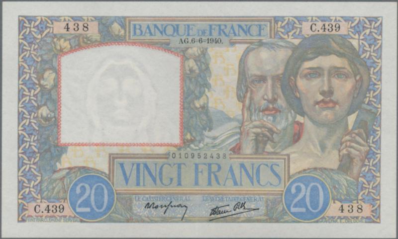 France 20 Francs 6.6.1940, P. 92 a, AU/UNC without any needleholes! Catalog number(s): P. 92 a (Image)