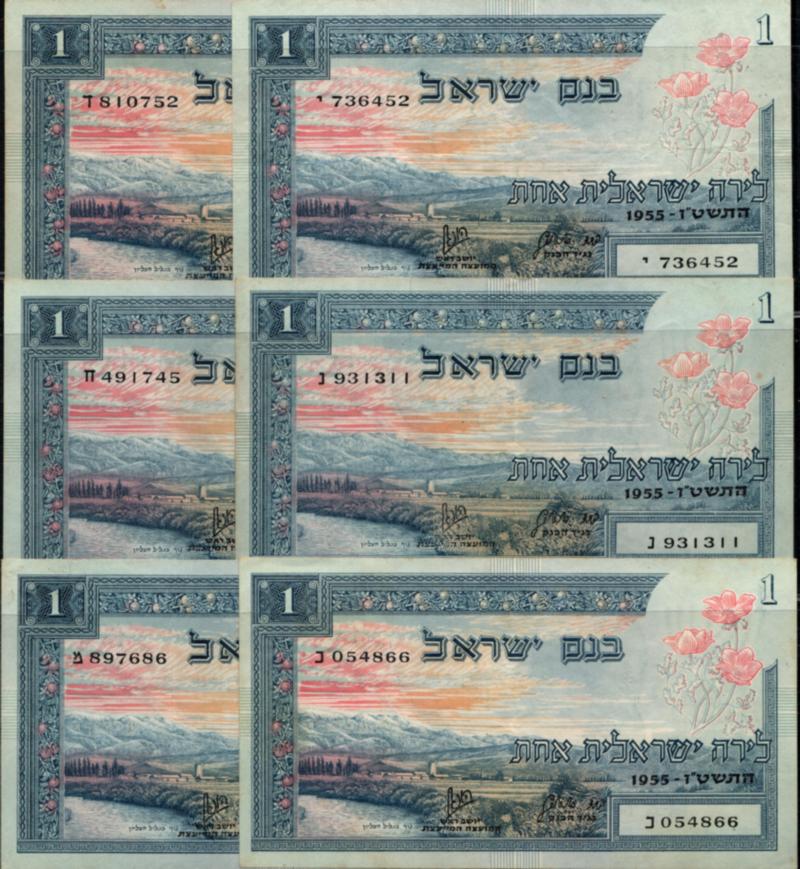 Israel. Bank of Israel Pick # 25a 1955, 1 Liraa group of 6 notes suitable for prefix collector. All Unc ד - 810752ח - 491745736452 - י