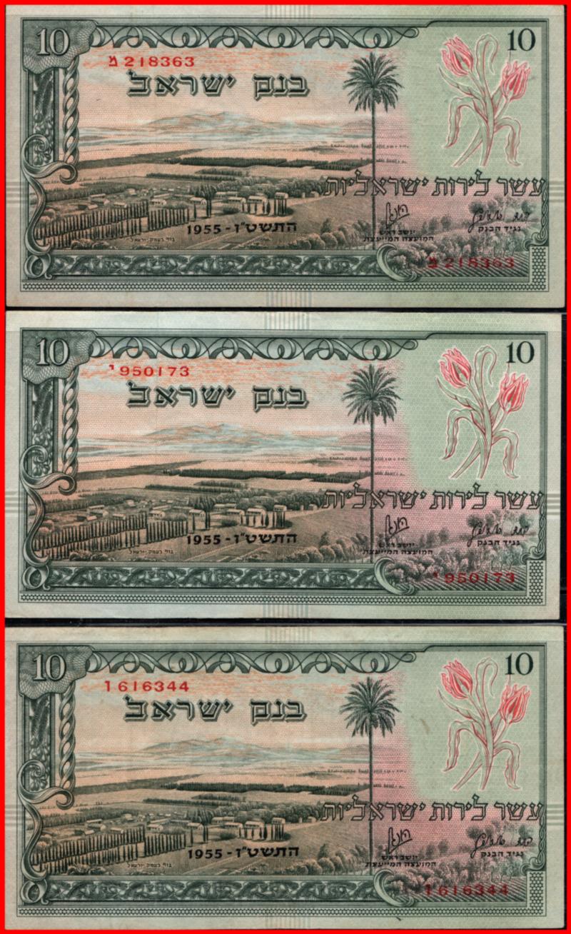 Israel. Bank of Israel Pick # 27a Bed S/N 1955, 10 Liraa group of 3 notes suitable for prefix collector. All Unc ו - 616344950173 - י218363 - מ All Unc (Image)