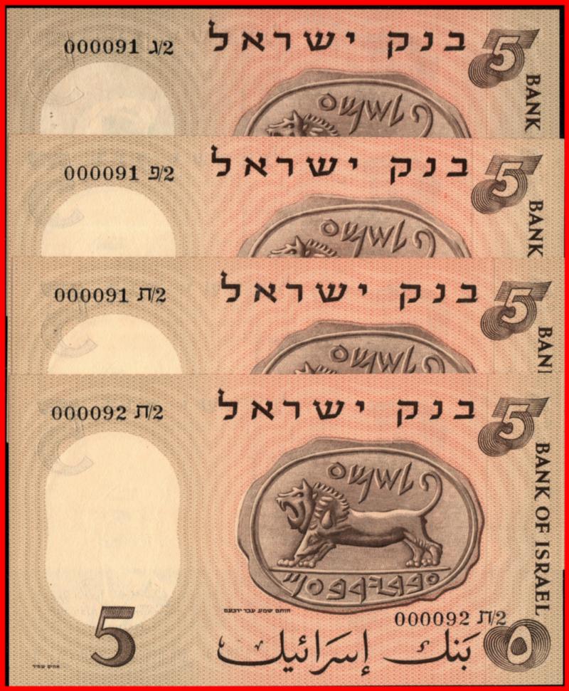 Israel. Bank of Israel 1958 a set of two banknotes, 5 lira catalog P-31. 3 MATCHING SERIAL NUMBERS.