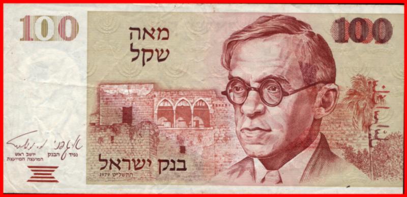 Israel 1979. There is an error on the 100 shekel banknote Jabotinsky P-47A Arabic inscription and the value 100 is printed on both sides. VF (Image)
