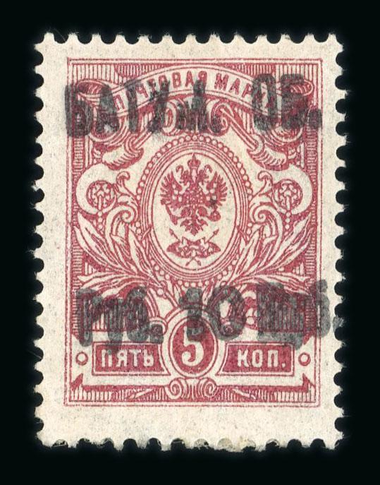 1919-20 mint group on stocksheet with 8 1920 surcharged issues incl SG 23, 30, 34 and 36, also 10r on 5k SG 9 (signed) and SG 41 etc. (S.G. £4500+). (Image)