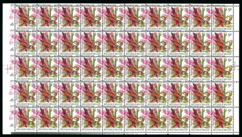1985, Chardonneret 9F curiosité: triple impression décalée dont une renversée en panneau entier de 50 exemplaires, spectaculaire et rarissime. (Image)