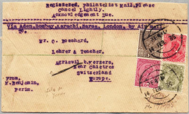 1939, 1 a. + 1 1/2 a. + 4 a. + 8 a., Indian stamps on registered Air Mail letter from PERIM/Aden to AGRISWIL/Switzerland, tied with cds PERIM 14 FEB 39, reverse with R label PERIM and cds ADEN 15 FEB 39, interesting sender and desirable, VF-XF! Estimate 400€.