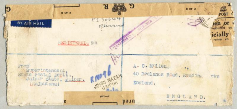 Automatisch generierte Übersetzung: 1947, in August 1947 ein BOAC Meer konzipieren auf der Strecke JAIPUR/Indien nach London/Grossbritannien kam vorbei die Meer vorgelagert BAHRAIN, die post wurde geborgen, ausgedörrt und abgestempelt Schaden auf dem Seeweg Wasser, wurde dieser Brief aufgegeben zu JOHRI Basar in JAIPUR Stadt am Staat Post Office, der Umschlag haben keine Briefmarken, diese wären verschollen während der Neigung in die Persische Golf, frisch und gesucht, Pracht! Schätzpreis 800 EUR.(Image)