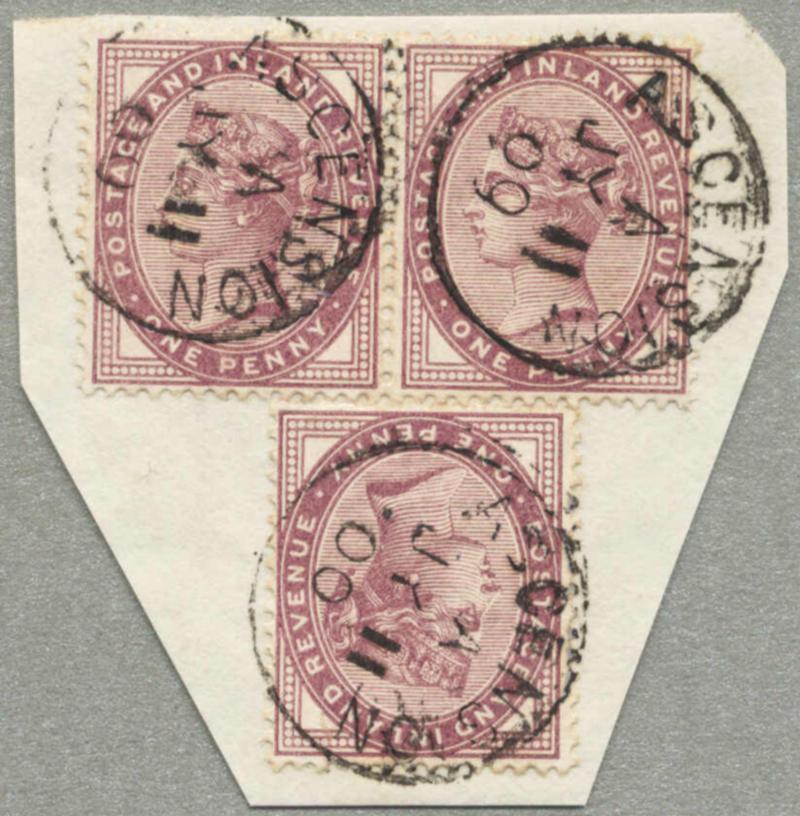 Automatisch generierte Übersetzung: 1900, Briefmarken von GB gebraucht in Ascension, 1 + 1 + 1d von Victoria, auf Briefstück, gestempelt ASCENSION, frisch und gesucht, ex Besancon, Kabinett! Schätzpreis 120 EUR.(Image)