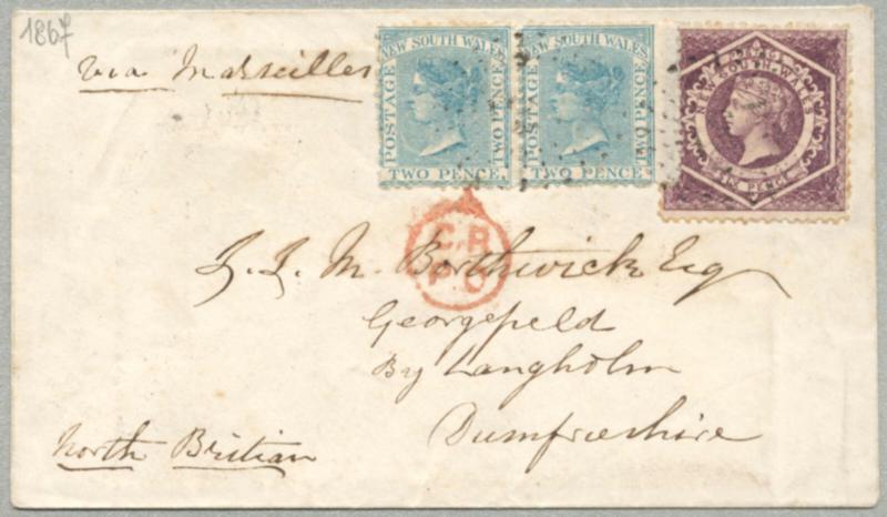 Automatisch generierte Übersetzung: 1866,2d + 2d + 6d, auf Brief von HINTON zu LONGHOLM/DUMFRIESSHIRE/Schottland, gestempelt mit schwarz Stern bersten, beiseite rot CBPO, handschriftlich über MARSEILLES, rückseitig mit HINTON nein 23 1866, Transit SYDNEY und Ankunft LANGHOLM JA 11 1867, ex Provera, schöne Brief, VF-XF! Schätzpreis 400 EUR.(Image)