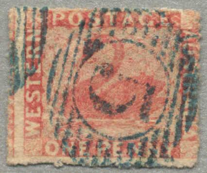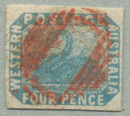 1854, lithographed 4 d in blue, wmk Swan sideways, a used example with good to large margins all round, cancelled by near complete strike of the void obliterator handstamp in RED, in use at Perth and in Guildford between 1855 to 1856, excellent, certificate RPSV 2019, fresh and desirable, ex Besancon, XF! Estimate 1.000€.