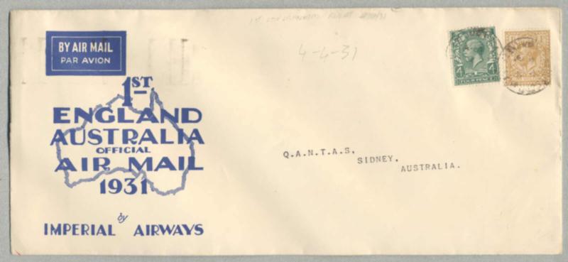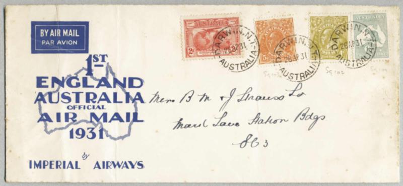 1931, 4d+1s, on first day Airmail cover from LONDON to SYDNEY - 4.4.31, cancelled MARKET STREET, reverse with DARWIN transit and SYDNEY arrival as well as boxed AIRMAIL SECTION GPO, very fresh letter in perfect condition, XF! Estimate 300€.