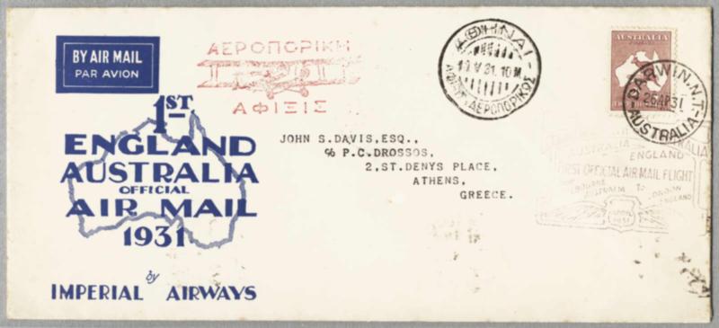 1931, 2s, maroon, wmk 7, on FIRST Imperial flight cover from DARWIN/Australia to ATHENS/Greece, cancelled DARWIN N.T. - AUSTRALIA 26. AP 31, 1 of about 225 flown covers, with beautiful aside cachets FIRST OFFICIAL AIRMAIL FLIGHT, red AIRMAIL ATHENS and black arrival ATHENS 10.V.31, reverse with hand struck ATHENS and machine cancel ATHENS, fresh and desirable, XF! Estimate 300€.