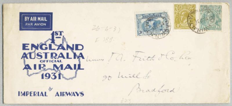 Automatisch generierte Übersetzung: 1931,3d + 4d + 1s 4d, (3), Wasserzeichen 7, auf erster kaiserlich Luftpostumschlag ab DARWIN/Australien zu BRADFORD/GB, gestempelt DARWIN N. T. - Australien 26. AP 31, mit Brief von die Managers für kaiserlich Luftpost, frisch und gesucht, Kabinett! Schätzpreis 300 EUR.(Image)