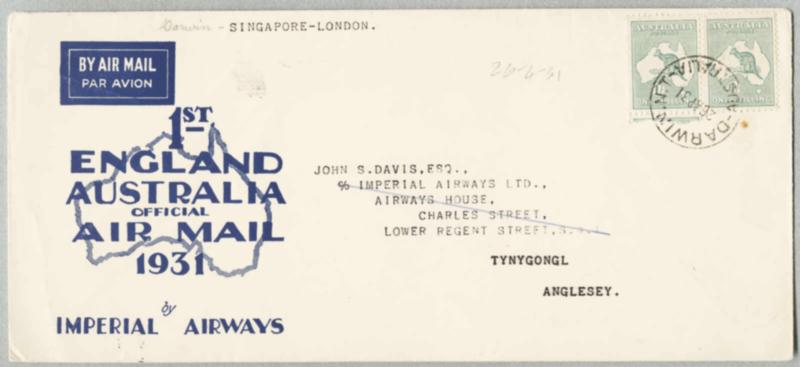 Automatisch generierte Übersetzung: 1931,1s, Paar, Wasserzeichen 7, auf erster kaiserlich Luftpostumschlag ab DARWIN/Australien nach London/GB über Singapur weitergeleitet nach TYN-Y-GONGL/Wales, gestempelt DARWIN N. T. - Australien 26. AP 31, rückseitig mit LONDON, violett Imperial Airways Stempel und Ankunft TYNYGONGL Stempel, seltener Bestimmgungsort, frisch und gesucht, Kabinett! Schätzpreis 300 EUR.(Image)