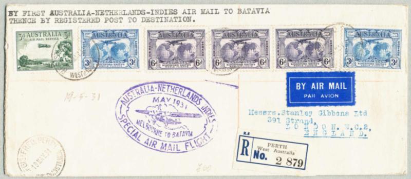 1931, 3+3+6+6+6+3d, (6) including one stip of three, on first flight Airmail cover from PERTH to BATAVIA/Netherland Indies and then by registered post to LONDON/England, cancelled with REGISTERED PERTH 19. MAY 31 WEST AUSTRALIA, aside nice violet cachet AUSTRALIA - NETHERLAND INDIES SPECIAL AIR MAIL FLIGHT, R label and blue BY AIR MAIL label, reverse with cds BATAVIA and rhomboid ABEL TASMAN BATAVIA CENTRUM as well as PERTH dispatch, very fresh letter in perfect condition, XF! Estimate 300€.