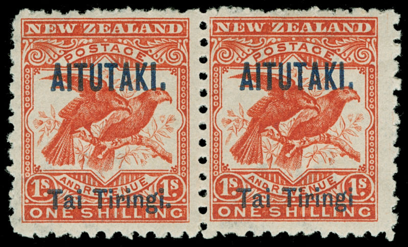 6c, 6 (7a, 7) 1903 1' bright red New Zealand Kea and Kaka overprinted, ERROR - "Tiringi" without stop (row 7, pos 12), rarely offered under catalogued error which occurred once in a sheet of 120, 74 examples printed (including all SG listed shades), in horizontal pair with normal, fresh, bright color, (Image)