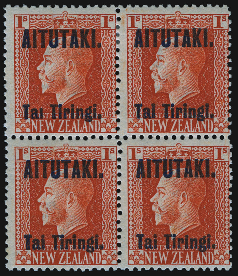 18c, 18d, 18e, 18a (14a, 14bc, 14bd, 14) 1917 1' orange K George V of New Zealand overprinted, right margin block of four containing all three ERRORS - "Tai" without dot on "i" (105 printed), "Tiringi" without dot on second "i" (70 printed), "Tiringi" without dot on third "i" (35 printed), trivial gum bend affecting SG 14 and 14a slightly which are NH, a wonderful fresh positional block (row 8, pos 11-12 and row 9, pos 11-12), only 35 printed of which many have been broken into singles, (Image)