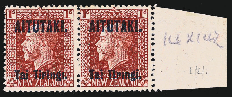 18e, 18d (14bd, 14bc) 1917 1' orange K George V of New Zealand overprinted right marginal pair (row 8, pos 11, 12) with ERRORs - "Tiringi" without dot on third "i" (35 printed) in pair with "Tiringi" without dot on second "i" (70 printed), fresh bright color, (Image)