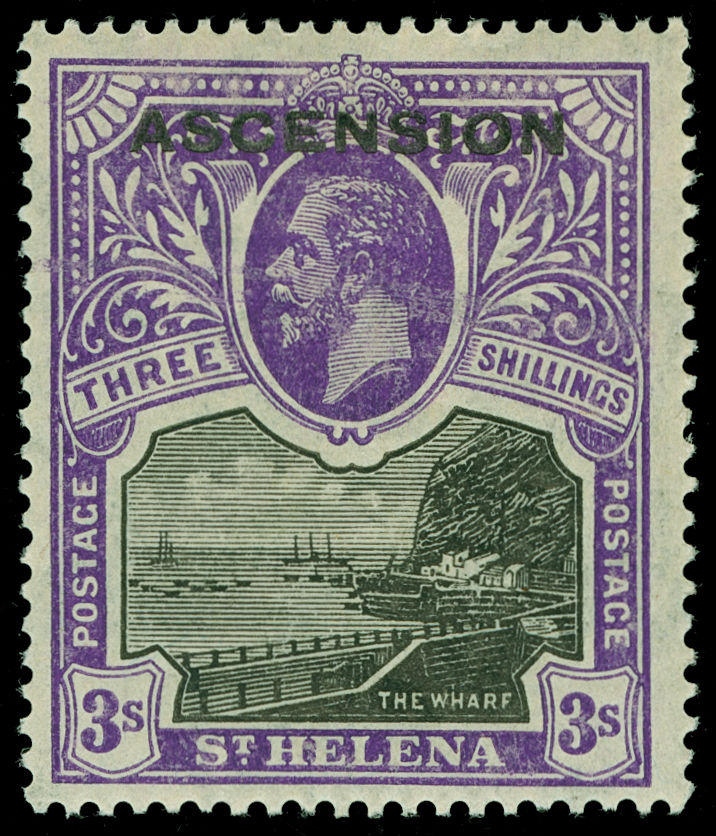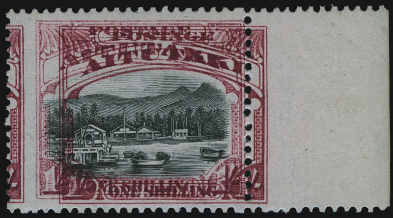 33 var footnoted (29 var footnoted) 1920 1' black and purple Avatua Harbor VARIETY - frame printed double, a right margin example which displays both frames completely (and portion of adjoining stamp at left), unwmkd, perf 14, one of ten right marginal examples printed, fresh, bright colors, very rare in this right marginal format, (Image)