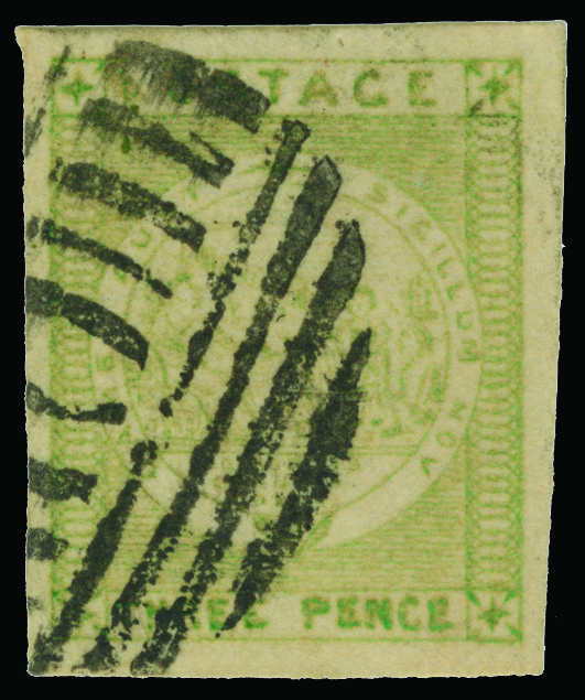 9a (39) 1850 3d yellow-green Seal of the Colony, soft yellowish wove paper, imperf, four large margins, used, (Image)