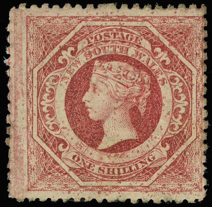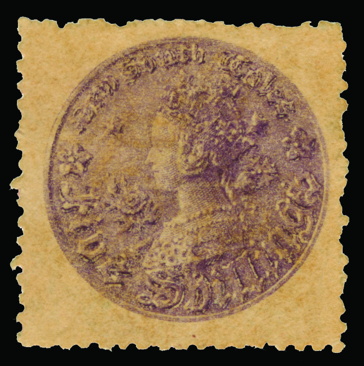1 (3) 1850 1d reddish rose Sydney View on soft yellowish paper, Plate I (no clouds), imperf, three full to close margins, grid cancel, no dot in upper left corner, (Image)