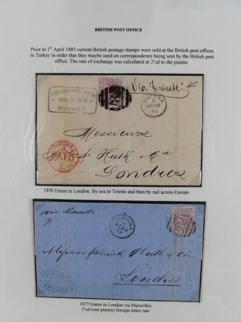 1876/1914, British Post Office in Smyrna, attractive exhibition collection with around 55 covers and cards, displaying a fine range of usages, rates and destinations, good selection of the British PO cancellations with Barred Oval "F87” (7), oval "REGISTERED SMYRNA” (both small and large types), circular "BRITISH POST OFFICE SMYRNA”, together with some parcel labels, printed matters, wrappers, some lovely single-, multiple- and combination frankings, etc., some occasional faults, toning and aging, overall in good condition, neatly mounted and well described on album pages.