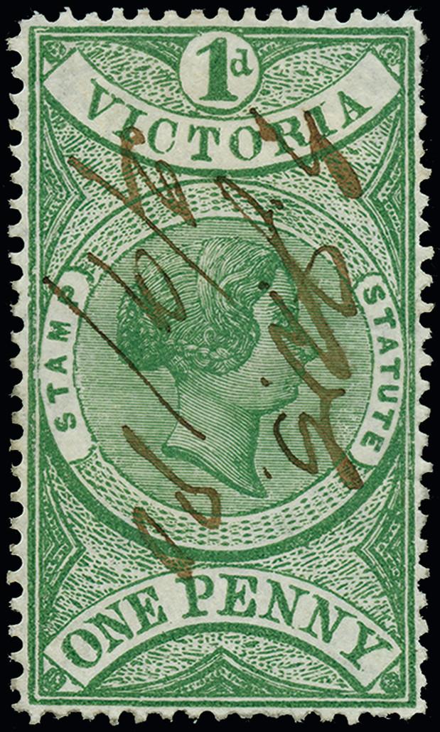 1884, Stamp Statute 1d. green, fiscally used single with upright watermark, and single and block of four with sideways watermark, without gum, used example few short perfs, block of four left stamps light crease, otherwise fine