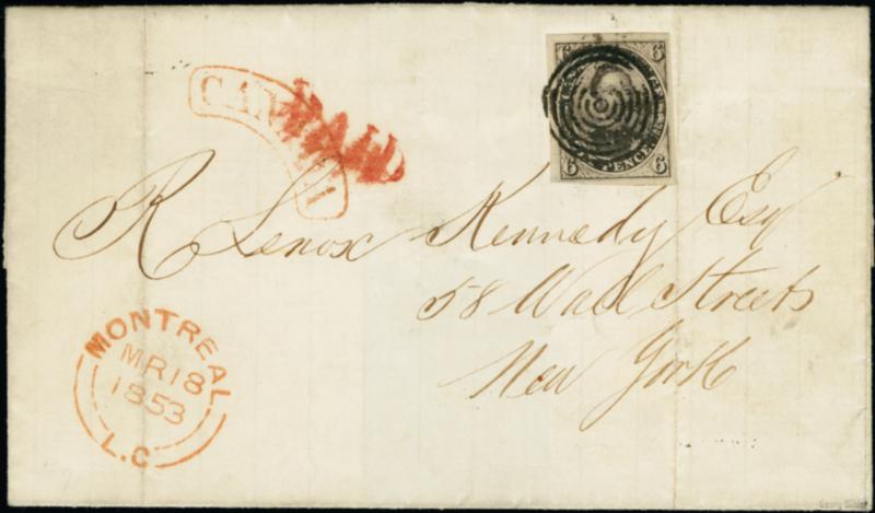 1852/57, Prince Consort 6 d. slate-violet, good to mostly very wide margins all around, tied by target cancel to lettersheet with adjacent red "MONTREAL MR 18 1853" to New York with curved red "CANADA" alongside, the stamp lifted for inspection, two file folds, a fine and scarce entire, signed Toaspern and Bühler