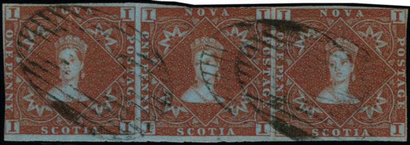 1851, 1 d. red-brown on blued paper, horizontal strip of three, fresh color, ample to good margins, center stamp touched at top, left stamp at left, used with oval of grids, an attractive and scarce entire