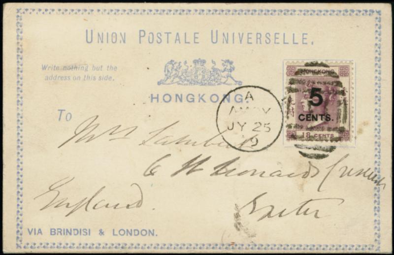 1879, postcard with postcard stamps 5 c., used with duplex "AMOY JY 25 79” to England, with transit mark of Hongkong and arrival mark. Few short perfs, otherwise fine.