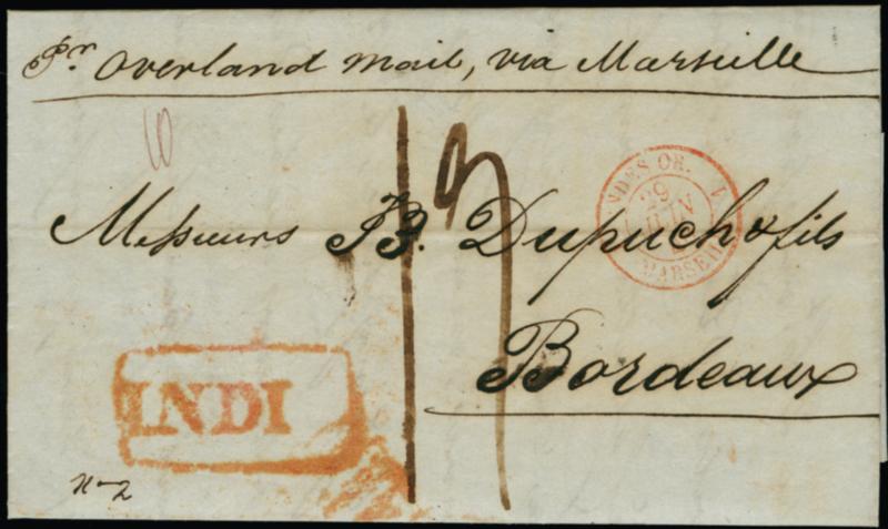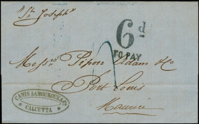1864, Entire folded letter from Calcutta to Port Louis, Mauritius, dated inside "Calcutta 2 Mai 1866", endorsed on front per steamer "ST JOSEPH", adjacent superb strike "6 d- TO PAY", reverse transit cds. "REUNION 4 JUIL. 66" and arrival "MAURITIUS JY 7 66"; very fine, a delightful and scarce maritime entire