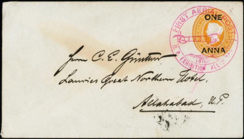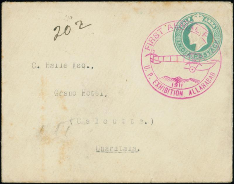 "FIRST AERIAL POST U.P. EXHIBITION ALLAHABAD 1911”, good strike in magenta on Postal stationery envelope 1a. on 2a6p. orange, addressed locally with despatch and arrival mark on reverse, fine, very rare and attractive, certificate RPSL (2023) (H&G 7)