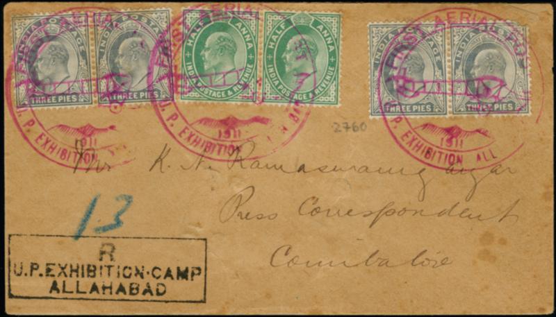 "FIRST AERIAL POST U.P. EXHIBITION ALLAHABAD 1911”, three good strikes on two horizontal pairs and block of four Edward 3p. gray and two singles ½a. green on front and reverse of registered cover with boxed registration mark "R U.P. EXHIBITION CAMP ALLAHABAD” alongside to Coimbatore, stamps on reverse tied by arrival cds., adhesives minor imperfections, some aging, yet attractive and very rare, certificiate RPSL (2023)