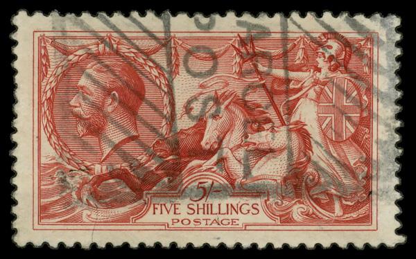 1919, King George V "Seahorse", Bradbury, Wilkinson printing, 5s rose red (Scott 180), Extremely Fine. SG 416. Scott $145. (Image)