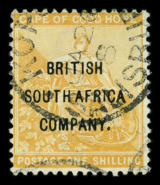 1896, "British South Africa Company" on Cape of Good Hope 1s yellow ocher (Scott 48), Fine. SG 64. Scott $165. (Image)