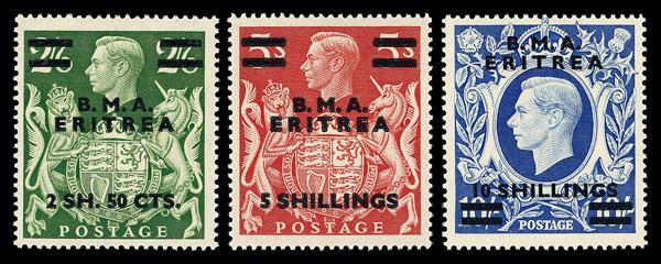 1948, King George VI, overprinted B.M.A. Eritrea (Scott 1-13), complete set of singles, o.g., never hinged, Very Fine. SG E1/E12; £75 ($100). Scott $89. (Image)