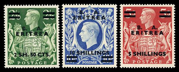 1950, King George VI, overprinted B.A. Eritrea (Scott 14-26), complete set of singles, o.g., never hinged, Very Fine. SG E13/E25; £100 ($130). Scott $117. (Image)