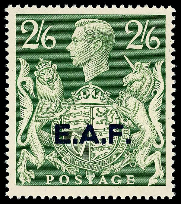 1943, King George VI, overprinted E.A.F. (Scott 1-9), complete set of singles, o.g., never hinged, Very Fine. SG S1/S9; £55 ($70). Scott $52. (Image)