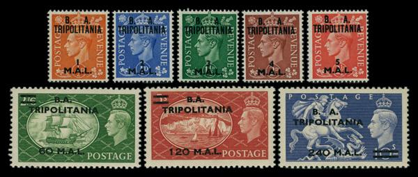1951, King George VI, overprinted B.A. Tripolitania (Scott 27-34), complete set of singles, o.g., never hinged, Very Fine. SG T27/T34; £80 ($100). Scott $94. (Image)