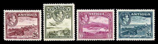 1949-50, 5s-£2 Arms complete (Scott 218-221), complete set of singles, o.g., never hinged, Very Fine. SG 224a/d; £151 ($190). Scott $254. (Image)