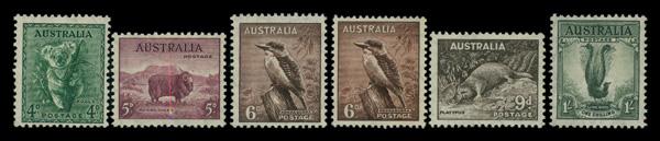 1937 Austrelia pictorials 4d through 1sh variations (Scott 171a-175a,173b), singles, o.g., never hinged, Very Fine. SG 170-174/190; £92 ($120). Scott $123. (Image)