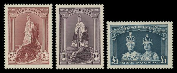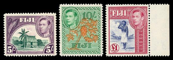 1938 King George VI "Robes" high values, 5s-£1 complete (Scott 177-179), singles, o.g., never hinged, Very Fine. SG 176-178; £148 ($190). Scott $175. (Image)